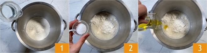 Para preparar la focaccia crujiente con calabaza y queso, comenzad con la masa: en el bol de una batidora planetaria verted el agua, la harina 1, la sal 2 y el aceite de oliva virgen extra 3.