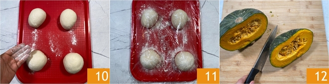 Colocad las 4 porciones de masa en una bandeja ligeramente enharinada 10, cubrid con film transparente 11 y dejad reposar en el frigorífico durante una hora 11. Mientras tanto, ocupad de la calabaza: divididla por la mitad 12.