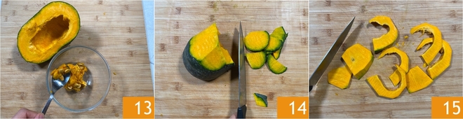 Eliminad las semillas y los filamentos internos 13, luego retirad la piel 14 y cortad la pulpa en rodajas de aproximadamente 2 centímetros 15.
