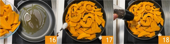 Verted la calabaza en una sartén con un chorrito de aceite caliente 16, luego sazonad con sal 17 y pimienta 18.