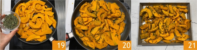 Aromatizad con tomillo, salvia y romero picados 19 y coced a fuego medio durante 10 minutos, añadiendo agua si es necesario 20; no debe cocerse completamente. Transcurrido el tiempo de cocción, transferid la calabaza a una bandeja para que se temple 21.