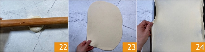 Retomad la masa del frigorífico y comenzad a extender con el rodillo la porción de 350 g 22 hasta obtener una lámina del mismo tamaño que la bandeja 23: nosotros hemos utilizado una bandeja de 40-30 cm. Si la masa tiende a encogerse dejadla reposar otros 5 minutos. Colocad la lámina en la bandeja y estiradla suavemente para cubrir también los bordes 24.