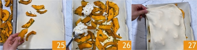 Distribuid la calabaza templada sobre la base de la focaccia 25, luego añadid el stracchino en cucharadas 26. Extendad la porción de masa de 300 g de la misma manera y utilizad la lámina obtenida para cubrir la focaccia 27.