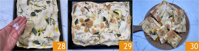 Sazonad la superficie con las hierbas aromáticas, un chorrito de aceite y los copos de sal 28. Finalmente, practicad cortes en la lámina superior para evitar que se hinche demasiado durante la cocción. Coced en horno estático a 250° durante 15 minutos, luego pasad a modo ventilado y proseguid la cocción por otros 5 minutos 29. Una vez dorada, sacad la focaccia del horno 29 y dejadla templar antes de cortarla en rebanadas. ¡Vuestra focaccia crujiente con calabaza y queso está lista para ser disfrutada 30!