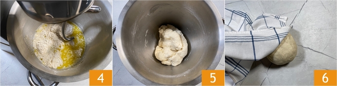 Encended la batidora planetaria con el gancho a velocidad media 4 y amasad hasta que la mezcla esté cohesionada 5. Dejad reposar la masa a temperatura ambiente durante 20 minutos, cubierta con un paño 6.