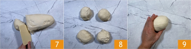 Transcurrido el tiempo de reposo, retomad la masa y divididla con la ayuda de una espátula 7: debéis obtener 2 porciones de 350 g (para la base) y 2 bolas de 300 g (para la superficie) 8. Formad cada bola en la superficie de trabajo 9.