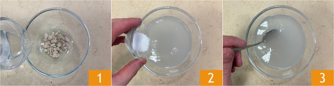 Para preparar la focaccia de 5 cereales con higos y tocino, lo primero que hay que hacer es ocuparse de la masa. En un bol desmenuza la levadura de cerveza, luego añade el agua 1, el azúcar 2 y mezcla para disolverla 3.
