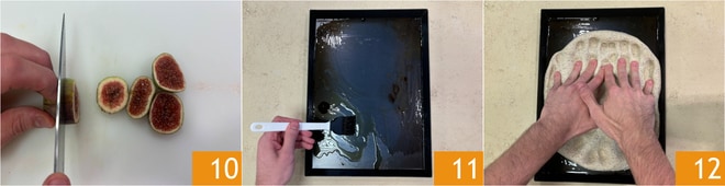 Mientras tanto, lava los higos y córtalos en rodajas de aproximadamente 0,5 cm de grosor 10. Vierte un hilo de aceite en una bandeja de 30x40 cm y distribúyelo por toda la superficie 11. Extiende la masa con las yemas de los dedos hasta cubrir toda la bandeja 12.