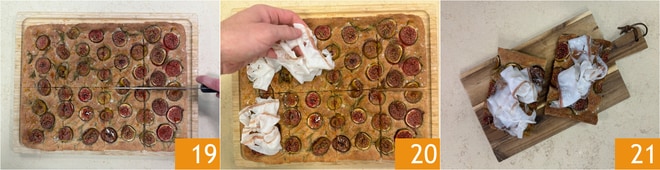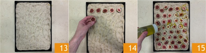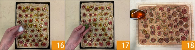 Con las yemas de los dedos presiona por toda la superficie para crear los típicos agujeros de la focaccia. Cubre con film y deja leudar nuevamente durante 20-30 minutos 13. Distribuye las rodajas de higo sobre la focaccia, haciendo una ligera presión 14. Rocía la superficie con el aceite 15.