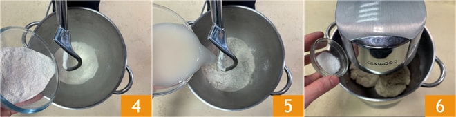 En una batidora con gancho (o en otro bol) vierte todas las harinas 4 y el agua con la levadura 5, luego activa hasta obtener una masa homogénea. Añade la sal 6.