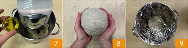 Agrega también el aceite 7 y trabaja durante unos minutos. Transfiere la masa a la superficie de trabajo y amasa durante otros 10 minutos, hasta que se vuelva lisa y elástica. Forma una bola 8 y colócala en un bol aceitado, cubierto con film 9 o con un paño. Deja leudar durante unas 2 horas, o hasta que doble su tamaño, en un lugar cálido.