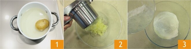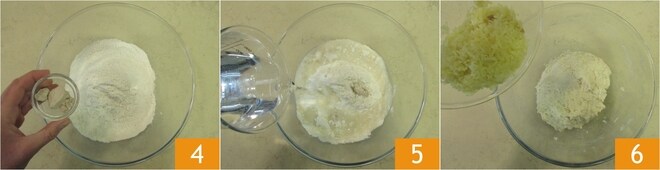 Añade la levadura fresca desmenuzada 4, el agua a temperatura ambiente 5 y las patatas machacadas 6.