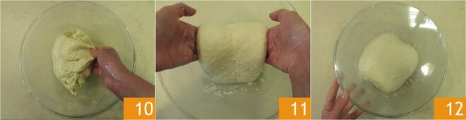 Trabaja la masa hasta que el aceite esté completamente absorbido 10, luego realiza pliegues de refuerzo levantando la masa con las manos 11 y doblando los bordes hacia abajo. Cubre el bol con film plástico y deja levar en el horno apagado con la luz encendida durante aproximadamente 2 horas o hasta que doble su volumen 12.