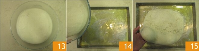 Pasado el tiempo de levado 13, unta bien una bandeja de 30x40 cm. Vuelca la masa dentro 14 y extiéndela delicadamente con las manos hasta cubrir toda la superficie 15.
