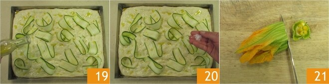 Transcurrido este tiempo, condimenta la superficie con un hilo de aceite 19 y espolvorea con flor de sal 20. Cocina en horno estático precalentado a 200° en la rejilla del medio durante unos 30 minutos. Mientras tanto, lava y limpia las flores de calabacín, dejándolas enteras 21.