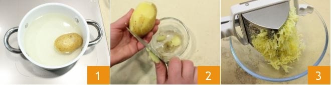 Para preparar la focaccia de trigo quemado con tomatitos, lo primero que debéis hacer es poner a hervir las patatas en agua salada durante aproximadamente 20 minutos 1, el tiempo de cocción depende del tamaño de las patatas; si al pincharlas con un tenedor la patata se resbala fácilmente, significa que están listas. A este punto peladlas 2, pasadlas por un prensapatatas 3 y dejadlas templar.