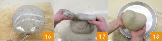 Luego, dadle plegados de refuerzo llevando las partes externas de la masa hacia el centro 13. Formad una bola 14 y pasadla a un bol grande 15, cubrid todo con film transparente y dejadla reposar durante aproximadamente 1 hora en el horno solo con la luz encendida, luego colocadla en el frigorífico y dejadla fermentar toda la noche.
