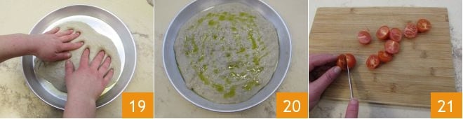 Con las manos engrasadas, extendéd la masa presionando con los dedos hasta cubrir toda la bandeja 19. Espolvoread la focaccia con aceite 20, luego lavad bien los tomatitos y cortadlos por la mitad 21.
