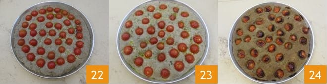 Colocadlos sobre toda la focaccia, con la parte de la piel hacia arriba 22 y dejad fermentar nuevamente durante una hora a temperatura ambiente. Finalmente, añadid el orégano y la sal 23 y hornead en horno ventilado precalentado durante unos 40 minutos a 190°C 24.