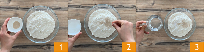 Para preparar la focaccia rústica con salami y queso, empezad por la masa. En un bol poned la harina y la levadura seca de panadería 1. Añadid una pizca de azúcar 2 y el agua 3.