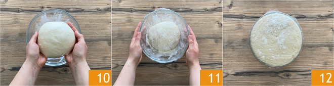 Colocadla en un bol ligeramente enharinado 10, espolvoread con un poco de harina y cubrid con film transparente 11. Dejad levar hasta que doble el volumen en el horno apagado con la luz encendida; tardará aproximadamente 4 horas. Recuperad entonces la masa 12 y trasladadla a la superficie de trabajo enharinada.
