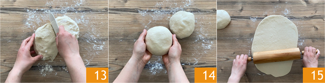 Dividid la masa en dos partes iguales 13 y trabajad cada pieza hasta obtener un panecillo homogéneo 14. Estirad luego el primer panecillo de forma que obtengáis un rectángulo de 25x35 cm 15.
