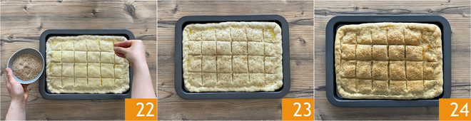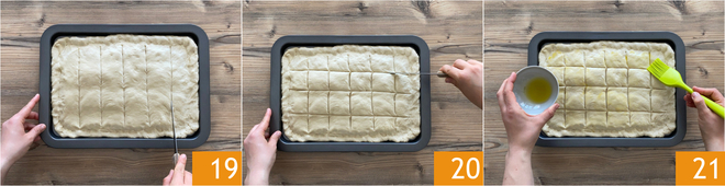Estirad también la otra porción de masa y colocadla encima. Apretad los bordes para sellarlos. Luego, con un cuchillo, haced cortes verticales 19 y después horizontales 20, de modo que se formen cuadritos. Pincelad toda la superficie de la focaccia con aceite de oliva virgen extra 21.
