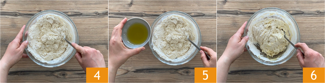 Mezclad para amalgamar los ingredientes 4, luego añadid también el aceite 5 y mezclad de nuevo hasta obtener una mezcla homogénea 6.