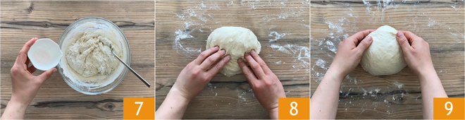 Por último añadid la sal 7 y volved a mezclar con un tenedor. Trasladad luego la masa a una superficie ligeramente enharinada, amasad durante unos 10 minutos hasta que quede lisa y homogénea 8, después tenéis que darle forma esférica 9.
