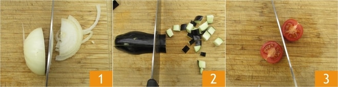Para realizar la focaccia sin gluten con caponata, comenzad con los ingredientes de la caponata rápida: limpiad la cebolla y cortadla en juliana 1, luego recortad las berenjenas y cortadlas en cubos de 2 cm 2. Finalmente, partid los tomatitos por la mitad 3.