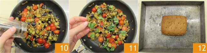 Salad, pimentad 10 y cocinad durante otros 10 minutos, luego aromatizad con algunas hojas de albahaca troceadas con las manos 11. En este punto, colocad las focaccias en una bandeja para hornear y horneadlas a 200° en modo grill durante 5 minutos 12.