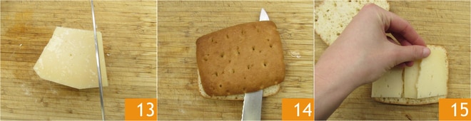 Mientras tanto, cortad el pecorino en rodajas de aproximadamente medio cm de grosor 13. Estáis listos para ensamblar los ingredientes: dividid la focaccia por la mitad horizontalmente 14 y colocad las rodajas de pecorino 15.