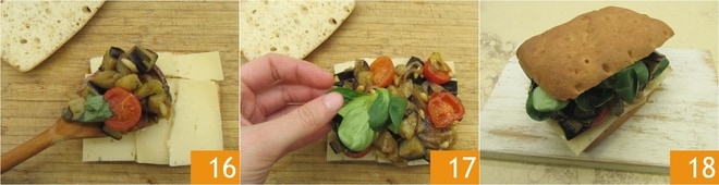 Añadid 2 cucharadas de caponata 16 y completad con los canónigos 17. Cerrad la focaccia y proceded de la misma manera con la segunda. ¡Vuestra focaccia sin gluten con caponata está lista para degustar 18!