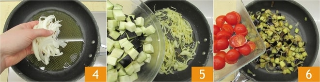 Poned la cebolla en una sartén antiadherente con un chorrito de aceite 4 y dejadla dorar a fuego lento durante unos 10 minutos. Añadid las berenjenas 5, subid el fuego y saltead durante otros 10 minutos, después añadid los tomatitos 6.