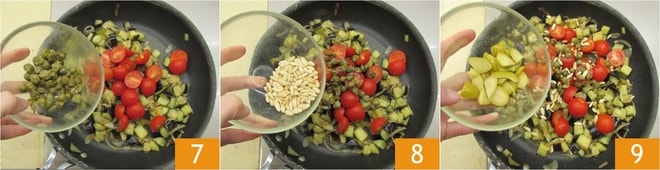 Sazonad con las alcaparras desaladas 7, los piñones 8 y las aceitunas cortadas groseramente 9.