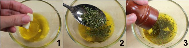 Comenzad preparando el aceite aromático: en un cazo verted el aceite de oliva virgen extra y calentadlo ligeramente, retiradlo del fuego y añadid un diente de ajo cortado por la mitad 1, el romero finamente picado con un cuchillo y las semillas de hinojo que habréis machacado ligeramente con la hoja de un cuchillo para liberar sus aromas 2. Añadid abundante pimienta 3 y dejad reposar y aromatizar el aceite por al menos 2 horas.