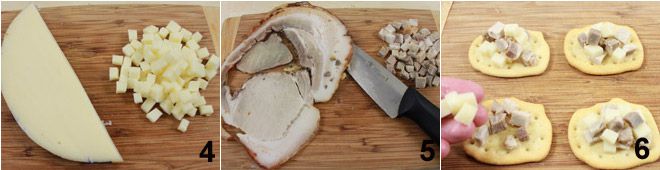 Retirad la corteza del provolone y cortadlo en cubitos 4 regulares (de aproximadamente 1 cm de lado). Realizad la misma operación con las 2 lonchas de porchetta 5. Cubrid cada focaccia con cubitos de porchetta y cubitos de provolone 6. Finalmente, añadid algunas hojas de canónigos, condimentad con unas gotas de aceite aromático y ¡servid los bocaditos!