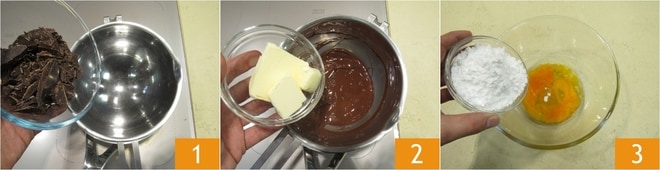 Para realizar el fondant au chocolat, primero picad groseramente el chocolate con un cuchillo y luego colocadlo en un bol para baño maría, es decir, colocad el bol sobre una cacerola con agua puesta al fuego 1. Removad constantemente con una espátula para derretirlo completamente, luego añadid la mantequilla 2. Seguid removiendo para mezclar la preparación. Una vez listo, apagad el fuego y reservad. En un bol, verted los huevos y la yema, luego añadid el azúcar glas 3 y las semillas de la vaina de vainilla.