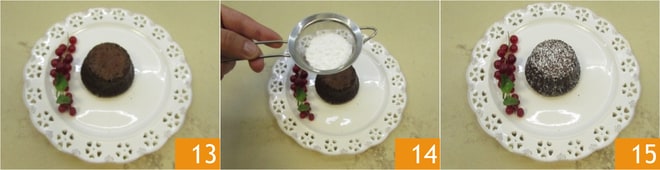 Volcad los pastelitos aún calientes en un plato de servir teniendo cuidado de no quemaros 13. Completad espolvoreando el fondant au chocolat con azúcar glas 14 y servid inmediatamente 15.