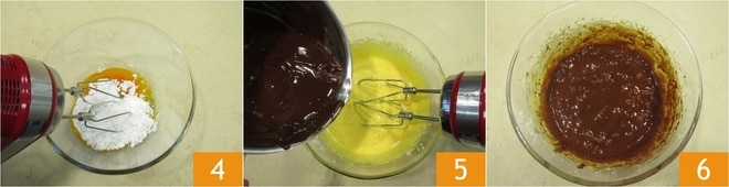 Trabajad la mezcla con batidoras eléctricas 4 hasta que esté clara y espumosa. En este punto, verted el chocolate fundido 5 y continuad mezclando con las batidoras para integrar completamente la mezcla 6.