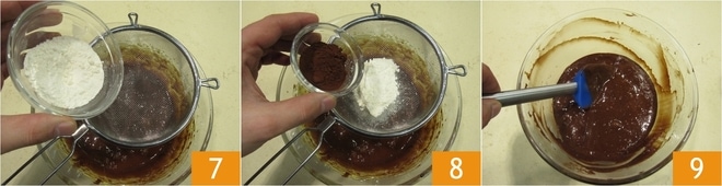 A continuación, incorporad los ingredientes secos a la mezcla de huevos: tamizad la harina 7 y el cacao amargo 8 en el bol, luego mezclad con una espátula para incorporar los ingredientes 9.
