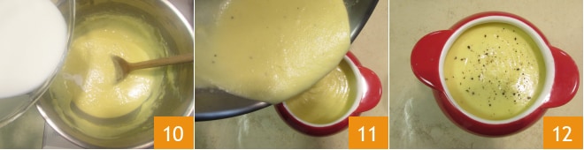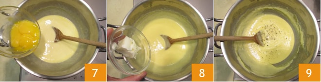 Al principio verá una masa, luego poco a poco se derretirá y se volverá más fluida. En este punto, agregue las yemas una a una 7, y mezcle continuamente. Incorpore también la mantequilla fría 8 y continúe mezclando. Añada pimienta al gusto 9 a la fondue a la Valdostana y mezcle nuevamente.