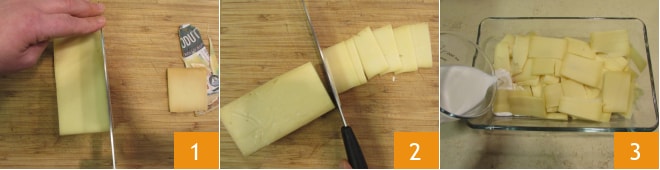 Para preparar la fondue a la Valdostana, primero elimine la corteza exterior de la fontina 1, luego córtela finamente 2. Transfiera el queso a una fuente rectangular y vierta la leche encima 3.