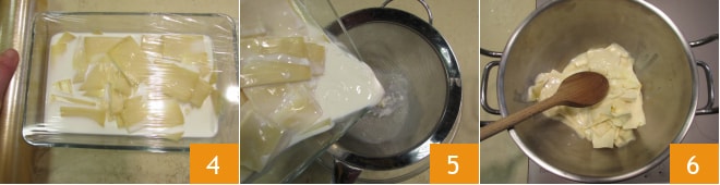 Cubra con papel film para alimentos 4 y deje en la nevera durante una noche. Transcurrido el tiempo de reposo en la nevera, escurra el queso de la leche a través de un colador 5 y reserve la leche. En un bol al baño maría, coloque el queso escurrido. Derrita el queso a fuego medio revolviendo con una cuchara de madera 6.