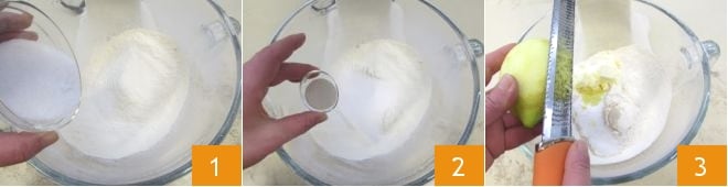 Para preparar los frailes fritos comienza tamizando la harina dentro de una batidora planetaria equipada con pala. Añade también el azúcar 1, la levadura 2 y la ralladura de 1 limón sin tratar 3.
