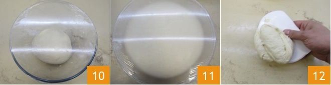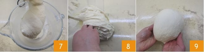 Al final, la masa deberá quedar bien unida alrededor del gancho 7. Unta ligeramente la superficie de trabajo y transfiere allí la masa 8, luego trabájala brevemente para darle forma de bola 9.