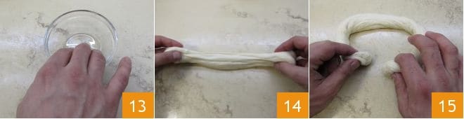 Unta la superficie de trabajo y engrasa ligeramente también tus manos 13, para manejar la masa con mayor facilidad; en la superficie de trabajo, alarga tu porción de masa para formar un cilindro 14. Une los extremos del cilindro 15