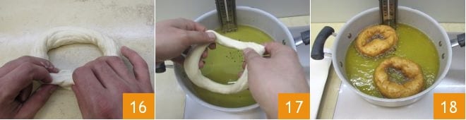 Y séllalos para obtener la forma de una rosquilla de unos 10 cm de diámetro 16. Tan pronto como termines de formar tu fraile, sumérgelo en aceite caliente a 170° C 17 y fríelo durante 3-4 minutos por cada lado 18.