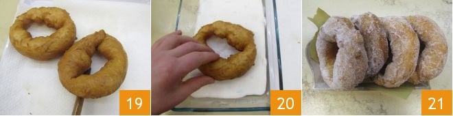 Cuando el fraile esté bien dorado por ambos lados, escúrrelo sobre papel absorbente 19 y pásalo, aún caliente, por una fuente baja y ancha en la que habrás colocado el azúcar granulada 20, revolviéndolo para azucarlo uniformemente. Continua de esta manera hasta agotar la masa: deberás obtener 9-10 frailes. Degusta tus frailes fritos bien calientes 21: ¡irresistibles!