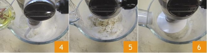 Enciende la batidora, y vierte en su interior el aceite en hilo 4 y, una vez absorbido, haz lo mismo con el agua a temperatura ambiente 5. Una vez que también esté incorporada a la masa, sustituye la pala por el gancho, y continúa amasando a velocidad media: tendrás que trabajarlo por un total de 7-8 minutos, agregando la pizca de sal cuando hayan pasado los primeros 5 minutos 6.